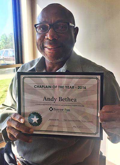 Chaplain of the year Andy Bethea, a volunteer since 2011, diligently visits patients throughout the hospital during his regular Tuesday rounds. His wisdom and patience supports the needs of those he visits, and his long history with the program has been helpful in improving the chaplain program as well as the patient experience.